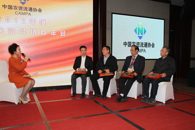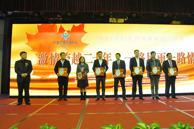 ? ??11月18日,中國農(nóng)業(yè)生產(chǎn)資料流通協(xié)會(huì)“2012年中國農(nóng)資經(jīng)銷商年會(huì)”在北京召開。來自國家發(fā)展和改革委員會(huì)、科技部、工業(yè)和信息化部、財(cái)政部、農(nóng)業(yè)部、商務(wù)部、國家工商行政管理總局、中國科學(xué)院、中國物聯(lián)網(wǎng)發(fā)展研究中心、中國石油和化學(xué)工業(yè)聯(lián)合會(huì)、中國商業(yè)聯(lián)合會(huì)、中國市場(chǎng)學(xué)會(huì)、人民日?qǐng)?bào)社、中央電視臺(tái)農(nóng)業(yè)頻道、光明日?qǐng)?bào)社、農(nóng)民日?qǐng)?bào)社、中華合作時(shí)報(bào)社以及供銷總社下屬13家社團(tuán)組織等單位的嘉賓和全國各地的會(huì)議代表約400余人參加了此次會(huì)議??偵缋硎聲?huì)副主任、中國農(nóng)業(yè)生產(chǎn)資料流通協(xié)會(huì)會(huì)長(zhǎng)、中國供銷集團(tuán)董事長(zhǎng)顧國新出席大會(huì)并致辭。中農(nóng)集團(tuán)董事長(zhǎng)、黨委書記肖仲凱,集團(tuán)黨委副書記李憲賓,集團(tuán)董事、中農(nóng)控股總經(jīng)理羅德強(qiáng)等作為受邀嘉賓出席了大會(huì)。