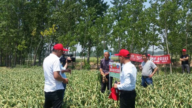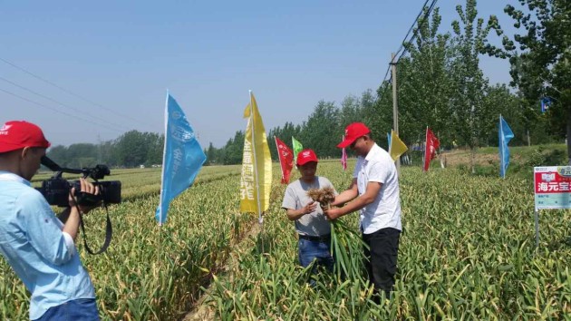 5月18日,中農(nóng)控股產(chǎn)品研發(fā)營(yíng)銷中心一部的山東省區(qū)經(jīng)理陳冬燁、區(qū)域經(jīng)理陳登建、百優(yōu)農(nóng)資公司全體員工、當(dāng)?shù)乜h各鄉(xiāng)鎮(zhèn)合作伙伴、種植大戶、當(dāng)?shù)仉娨暸_(tái)記者組成“海元寶”大蒜觀摩團(tuán),一起走訪了金鄉(xiāng)縣羊山村等周邊5個(gè)村的“海元寶”大蒜示范田,見(jiàn)證了海元寶肥料的神奇肥效。