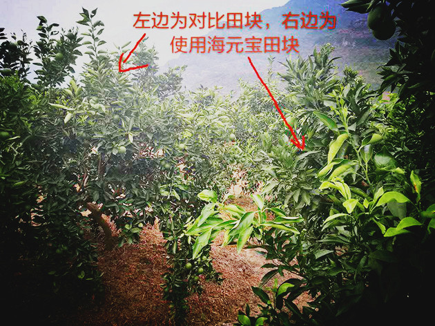 ? ? 但是當(dāng)我們走到韓慶祥地里,完全是另外一種景象:他家的柑橘樹一片濃綠,只有少數(shù)嫩梢出現(xiàn)缺水現(xiàn)象。周邊柑橘田塊都不同程度的受到旱災(zāi),有幾個農(nóng)戶正在用車?yán)诳购?。示范園柑橘遠處望去就像沙漠里的一片綠洲!有幾個干活的農(nóng)戶也停下了手里的活過來交流,他們開始都以為示范田這塊地是專門抗旱了的。韓慶祥說:“我沒時間抗旱,現(xiàn)在也沒水源,我這塊田是用了‘海元寶’復(fù)合肥的功勞。