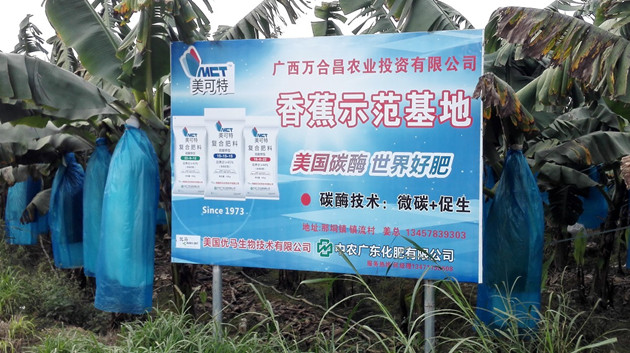 ? ? 據香蕉種植基地負責人介紹,過去基地一直使用進口肥,隨著時間增長,用量越施越多,但長勢卻一年不如一年,并且土壤板結越來越嚴重,施肥高峰階段曾經一次性施用200噸進口肥料。在“美可特”碳酶復合肥南寧經銷商的介紹下,我們逐漸了解“美可特”碳酶復合肥的微碳技術和促生技術對作物及土壤的作用,于 2015年7月上旬開始在香蕉示范田上應用60噸“美可特”碳酶復合肥,并按廣東中農農化服務人員的指引減少20%使用量,每月噴灌1到2次,每次施肥3兩/棵,剛開始感覺蕉葉厚度明顯增加、顏色油綠發(fā)亮。后續(xù)抽蕾下垂正常、蕾包更大、頭把蕉指有35顆,第七把蕉還有22個蕉指,蕉指長度飽滿度非常理想,后期發(fā)現土壤表層出現大量菌絲,土層出現許多黑色塊狀有機質。聽了香蕉基地負責人的介紹,再對比香蕉種植接地中沒有施用“美可特”碳酶復合肥的香蕉地,對比地塊明顯出現脫肥,葉子黃化,下垂嚴重,整株香蕉非常脆弱,前來觀摩的種植戶紛紛贊嘆:“一分錢一分貨,施了‘美可特’碳酶復合肥的蕉桿這么硬朗,葉子這么綠!在南寧周邊也難尋這樣的香蕉地了!”