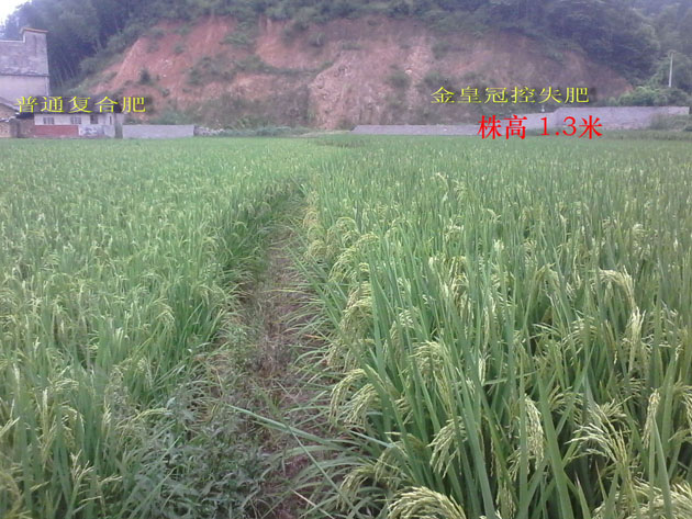 ? ? 在示范田現(xiàn)場(chǎng),施用金皇冠控失肥與施用普通肥料的水稻差異明顯,只見(jiàn)施用金皇冠控失肥的水稻長(zhǎng)勢(shì)良好,整片稻田植株達(dá)到1.3米左右,稻穗更為結(jié)實(shí)飽滿(mǎn)?!胺N好還要肥料好。種了40多年田,也沒(méi)看到這么好的稻子,每畝增產(chǎn)50-75公斤?!币晃徽趧谧鞯淖T姓老農(nóng)笑得合不攏嘴:“根長(zhǎng)莖粗不倒伏,病蟲(chóng)害也少了,感謝你們研制出這么好的肥料”。據(jù)這位老農(nóng)介紹,示范田今年種植的是廣兩優(yōu)1128,每畝施用金皇冠控失肥25公斤,用10公斤尿素作追肥,粗略估計(jì)今年畝產(chǎn)將達(dá)800公斤左右。