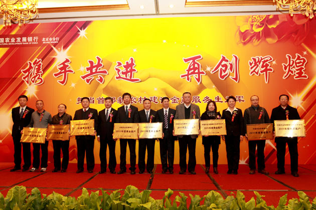 ?? ?2011年12月7日,中國農(nóng)業(yè)發(fā)展銀行北京分行表彰會(huì)在京舉行(以下簡稱“農(nóng)發(fā)行北京分行”),對獲得2011年度總行級(jí)、分行級(jí)黃金客戶以及分行級(jí)優(yōu)質(zhì)客戶的單位進(jìn)行表彰和授牌,中農(nóng)控股監(jiān)事會(huì)主席李憲賓、中農(nóng)控股財(cái)務(wù)冷權(quán)受邀參會(huì)。會(huì)上,中農(nóng)控股獲得農(nóng)發(fā)行北京分行授予的總行級(jí)“黃金客戶”稱號(hào),李憲賓代表公司致辭并領(lǐng)取獎(jiǎng)牌。
